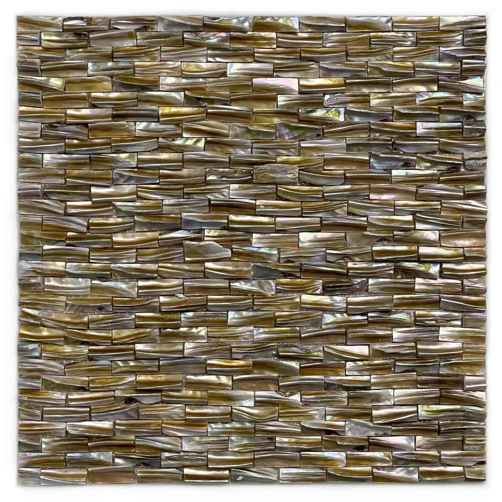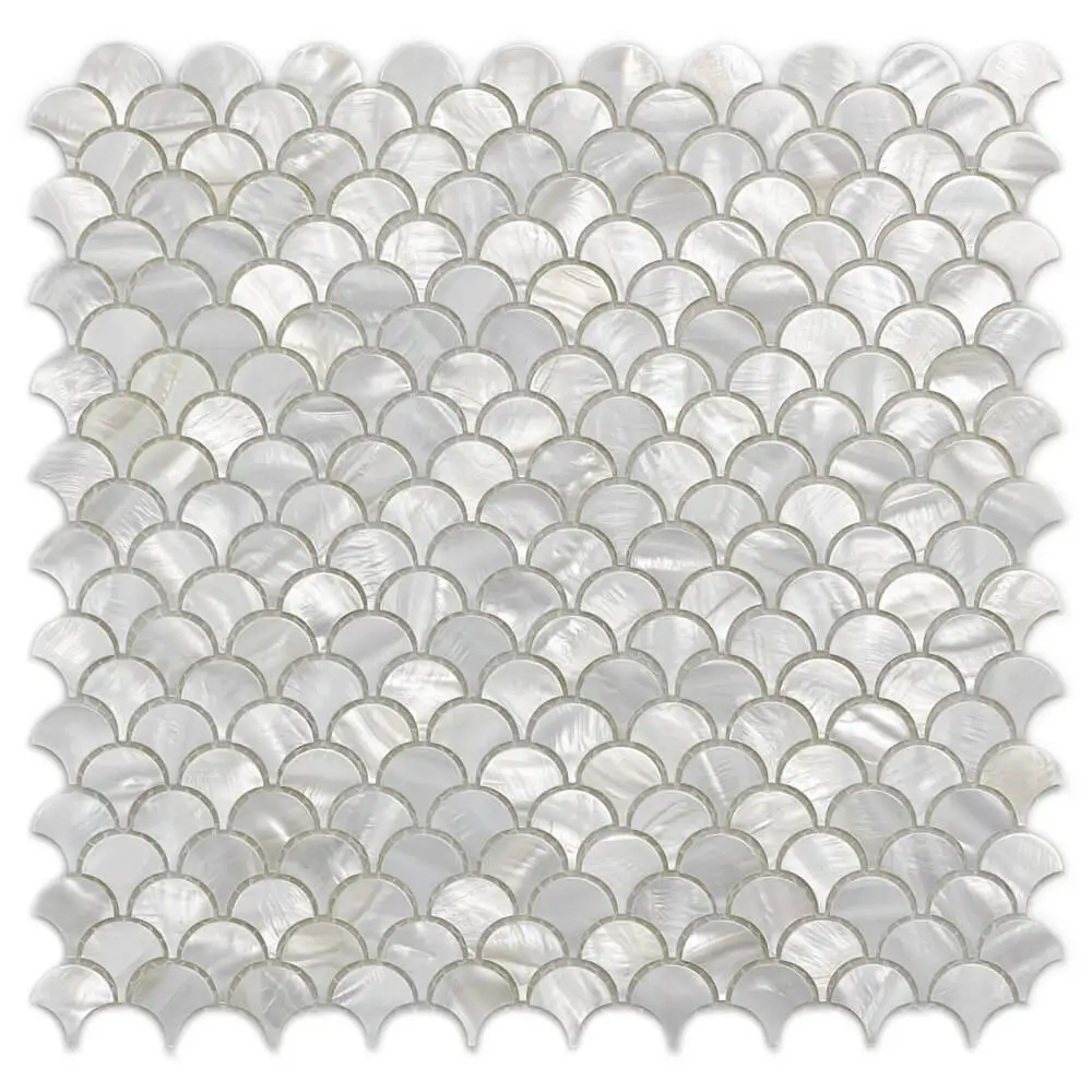 Mother of pearl is an iridescent material that builds up on the inside of mollusk and oyster shells. Mother-of-pearl tiles, also known as shell mosaic tiles, are made by carefully cleaning shells with a combination of hydrochloric acid and bleach until a smooth surface is achieved.